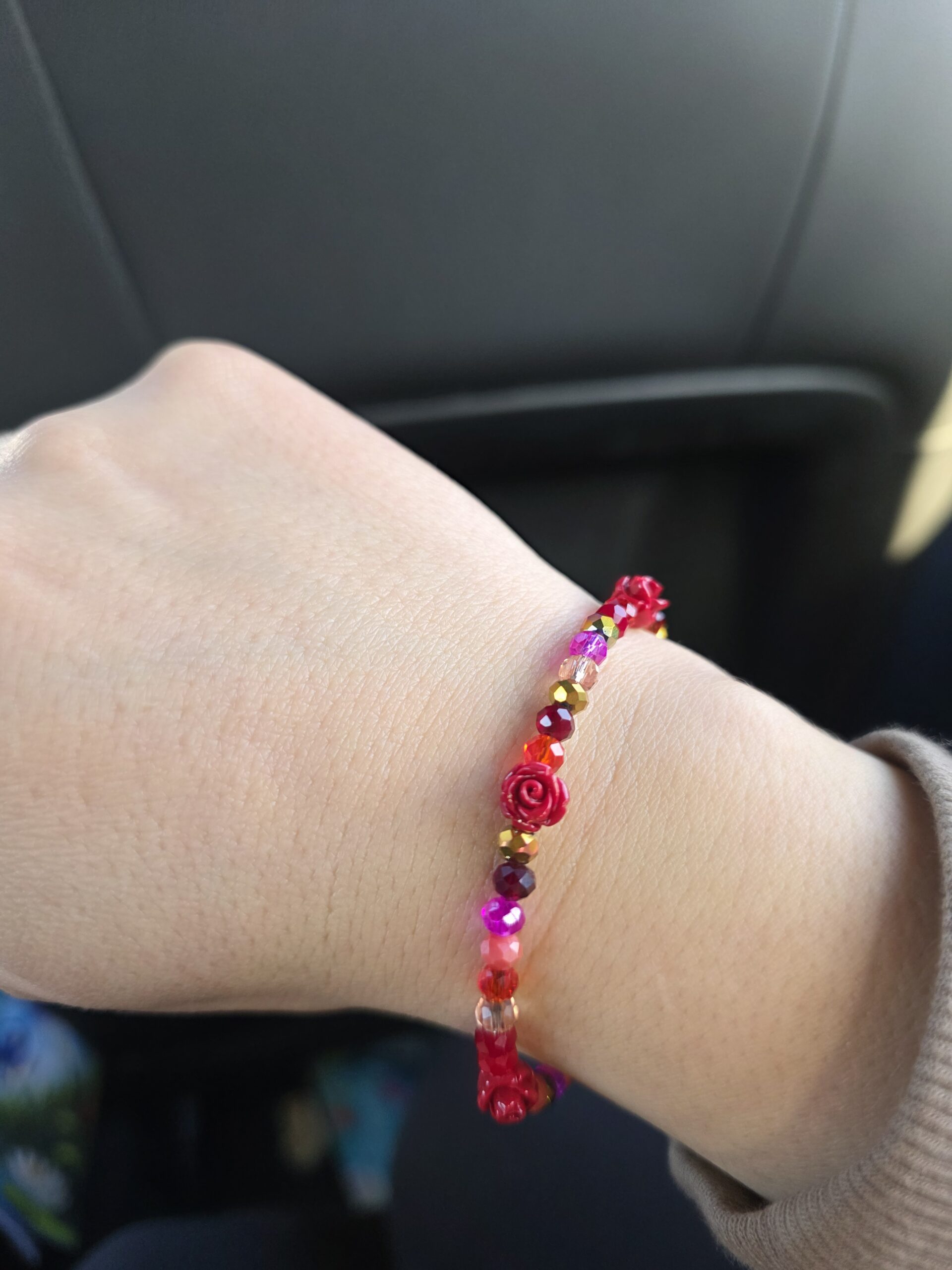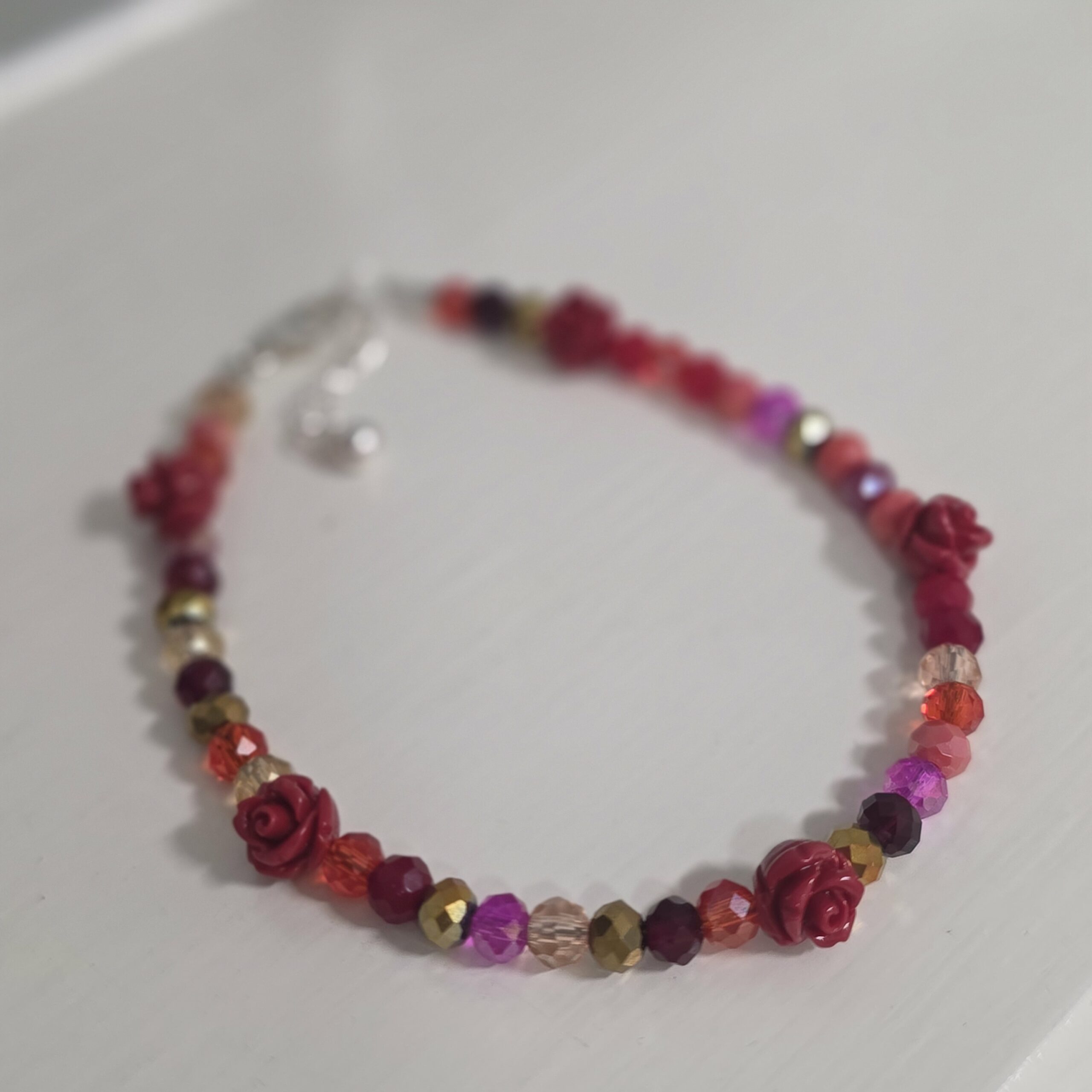 Designed by Arabella and lovingly strung by Alyssa, this beautiful bracelet features a mix of tiny faceted glass crystals and delicate acrylic roses in rich pinks, reds and warm Valentine tones — but made to be worn and enjoyed every day. Each bead was hand-chosen by Arabella herself, creating a meaningful and joy-filled piece full of colour and sparkle. Finished with a 1-inch extender so it can be worn from 7 to 8 inches, this bracelet is a precious collaboration from our Sparkle Towers family to yours.