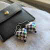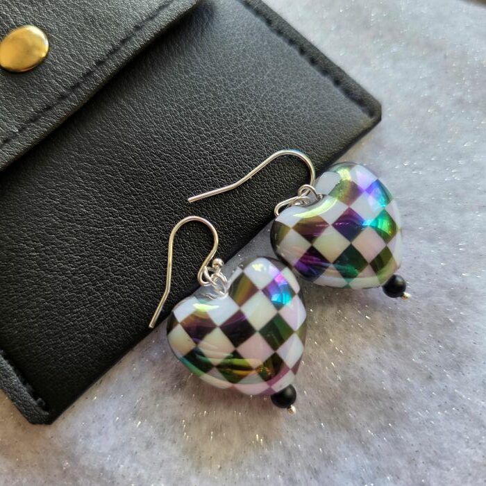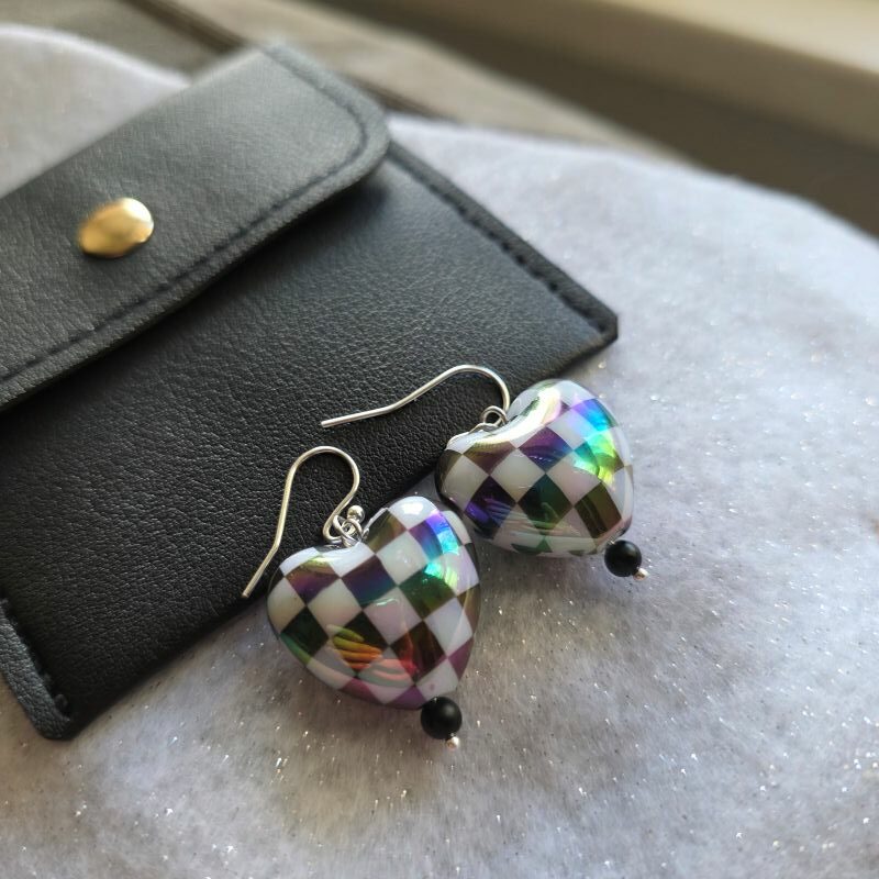 Aurora Borealis Chequered Puffed Heart Drop Earrings in Sterling Silver