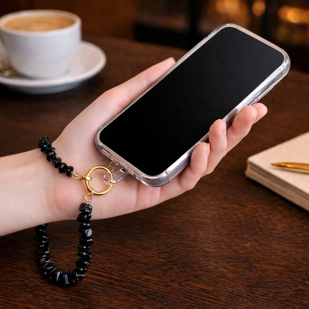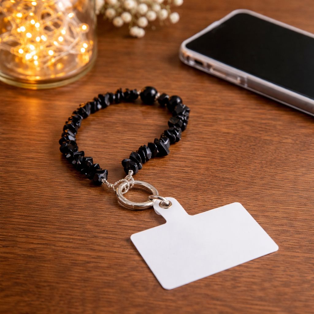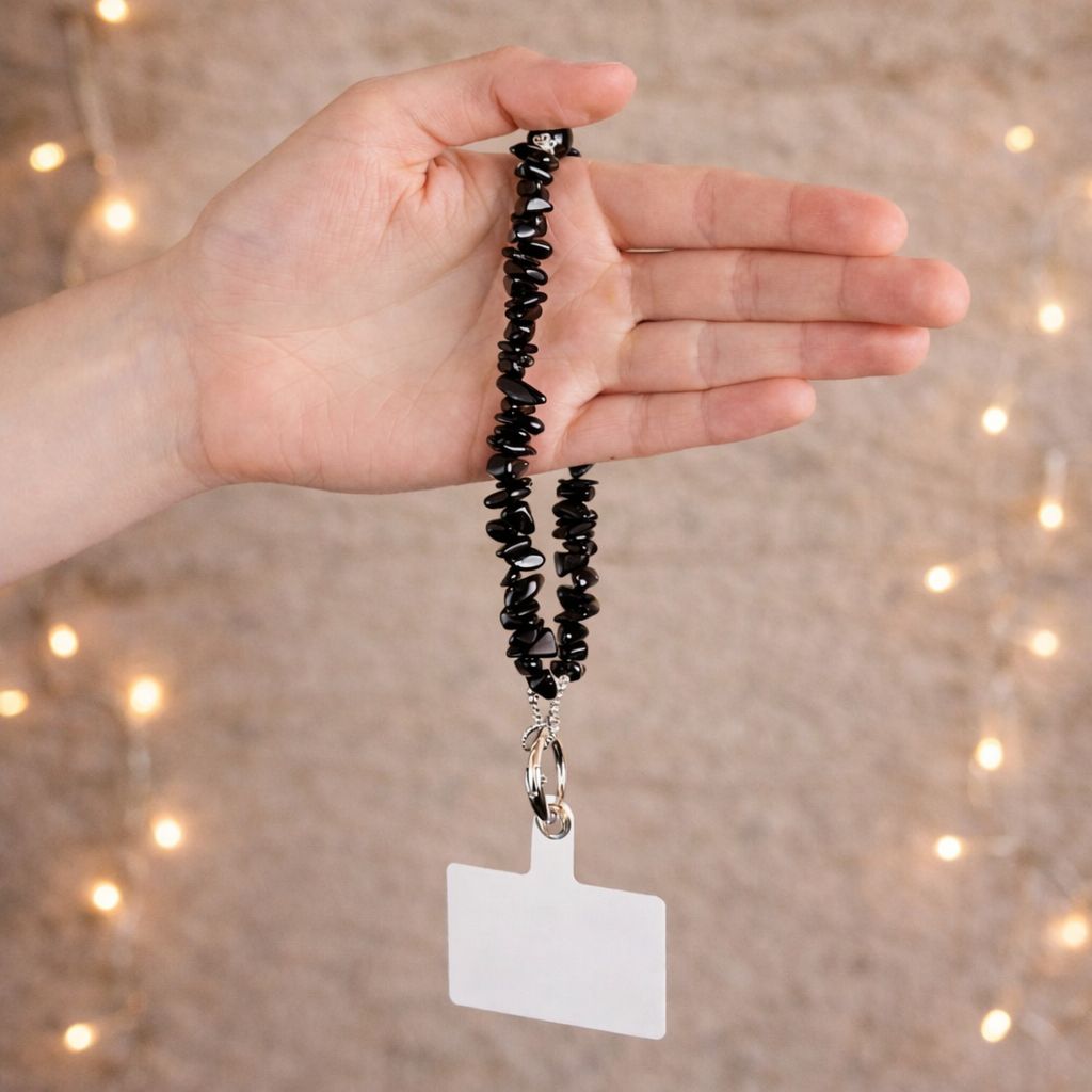 This handy phone strap is ideal for keeping your phone within reach, whether you are on the go or just want extra security. It features a clear insert that fits inside almost any phone case. Unclip the strap, slide the clear plate into your case so the tab aligns with the charging port gap, then refit your case. The gemstone strap clips securely onto the tab, giving you a reliable and easy attachment. Crafted from polished black obsidian gemstone chips, this piece carries a sleek, understated finish with a subtle natural shine. Each bead is unique, creating a beautifully organic texture that feels both modern and timeless.
