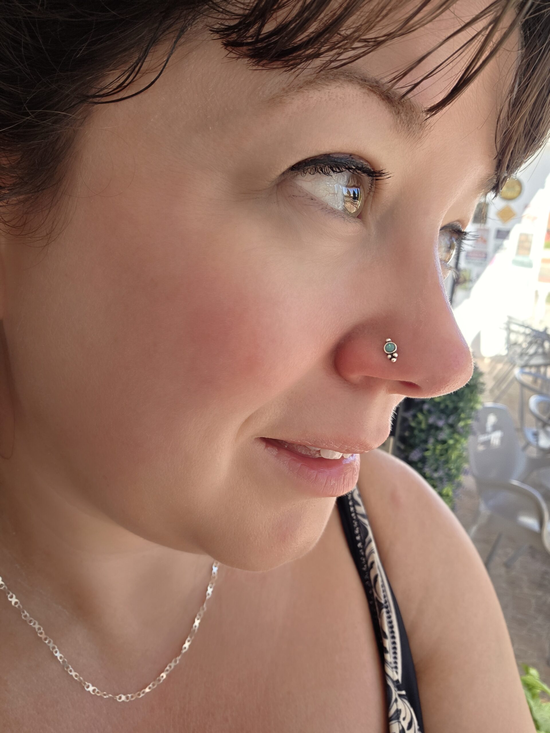 A beautiful and delicate sterling silver blue opal always steals the lime light and is probably the most glamorous piece in our stud collection! If you are looking for something a little bit different from ‘the norm’ then this is for you! This lovely pieces measures around 6.4mm in size. It can be carefully twisted into place and secured with the top of the coil pointing upwards inside the nose. Not suitable for carrying out intense sports in, please take care when washing your face.