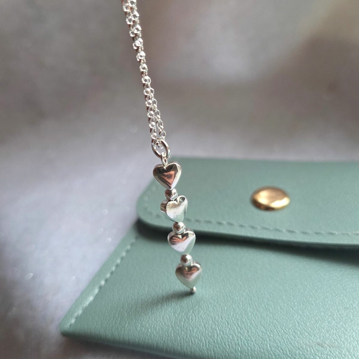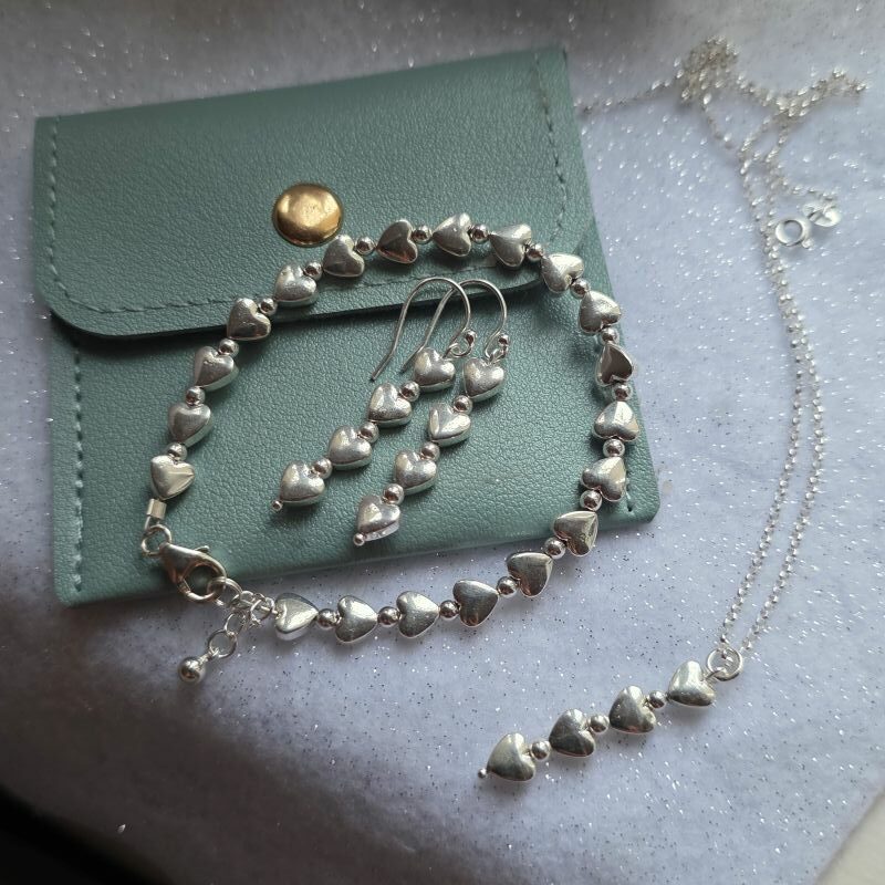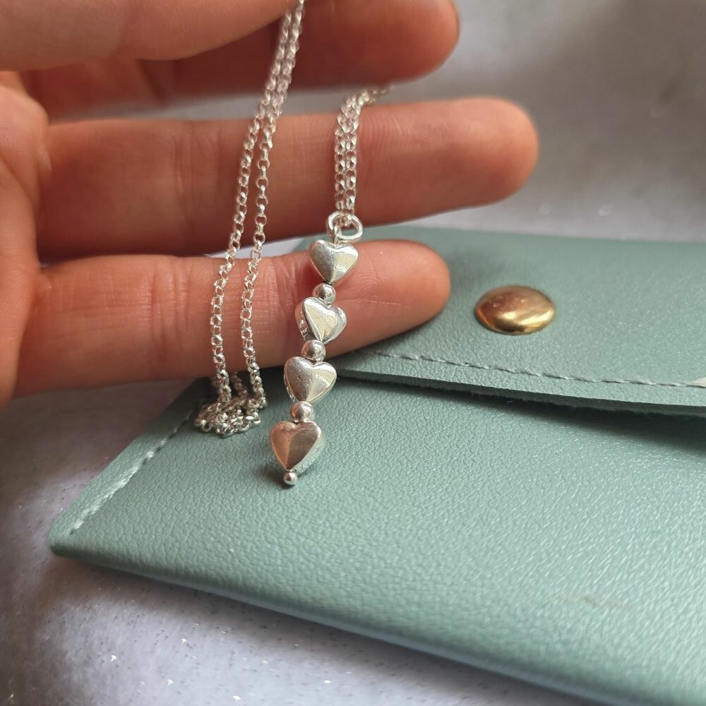 Now available for a limited time only, whilst stocks last! We have named this piece ‘Celebration’ as we designed it with the idea it would take you through Christmas Eve and New Year’s eve celebrations, and far beyond that too! Made entirely in sterling silver hematine heart beads, the dropper measures around 4cm in length and suspends from your choice of length of open link sterling silver chain. Matching items available. Absolutely beautiful!