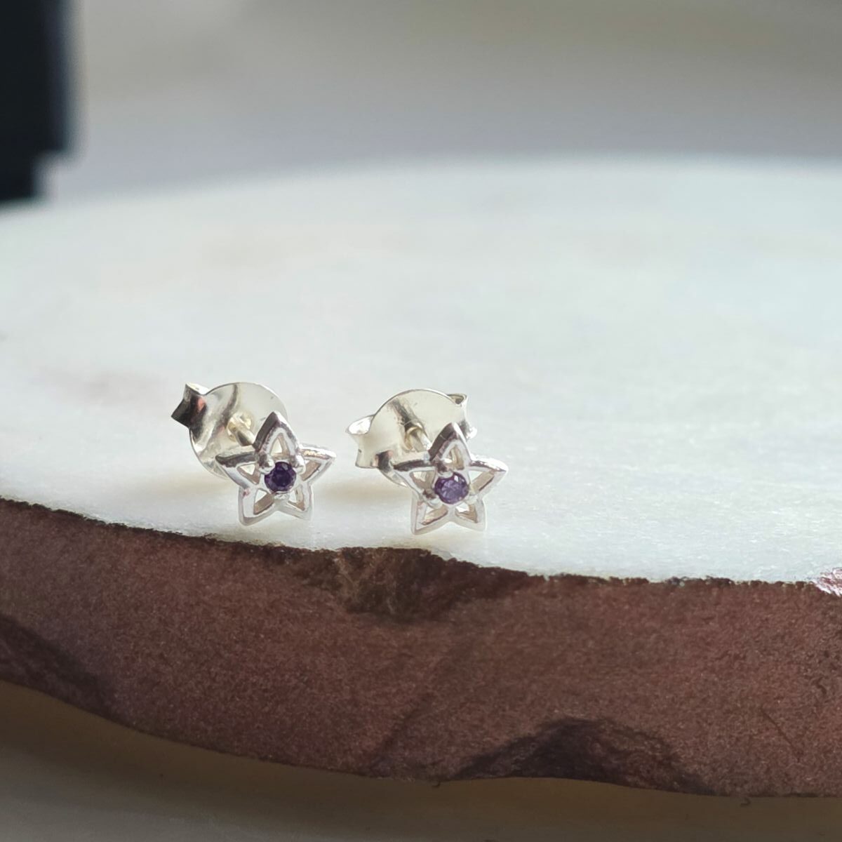 The perfect addition to our amazingly popular emerald city collection, these tiny sterling silver star studs are small enough to wear in either a first or second ear piercing and are designed with comfort in mind. They’re even suitable for our younger collectors thanks to their price and size. Made in sterling silver, they feature tiny amethyst stones set into the centre and measure 5mm in size.
