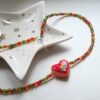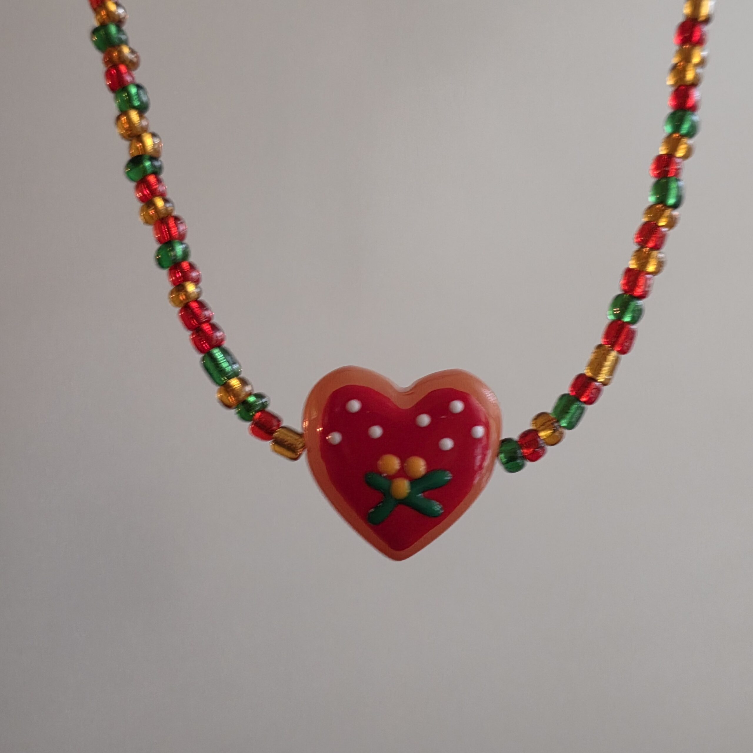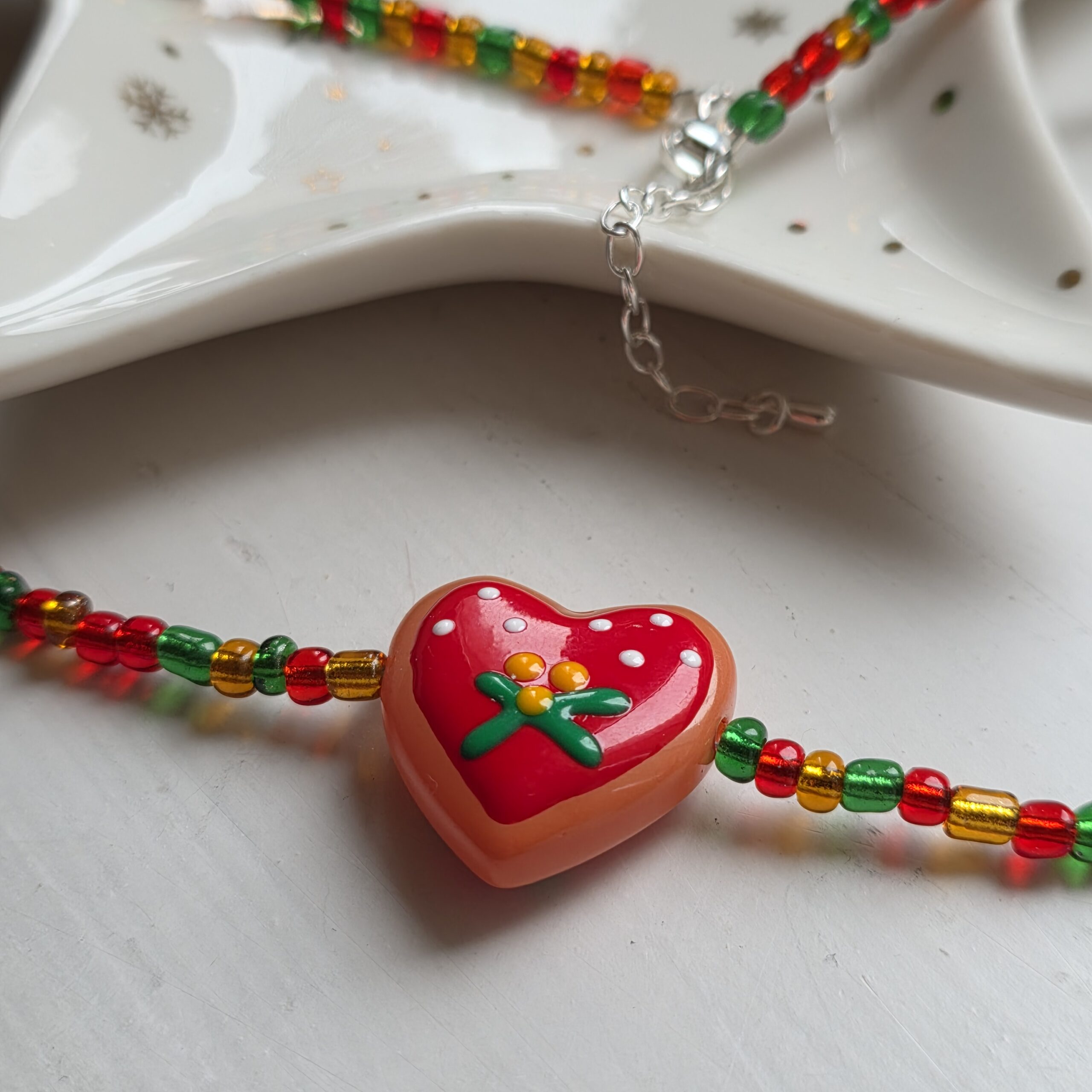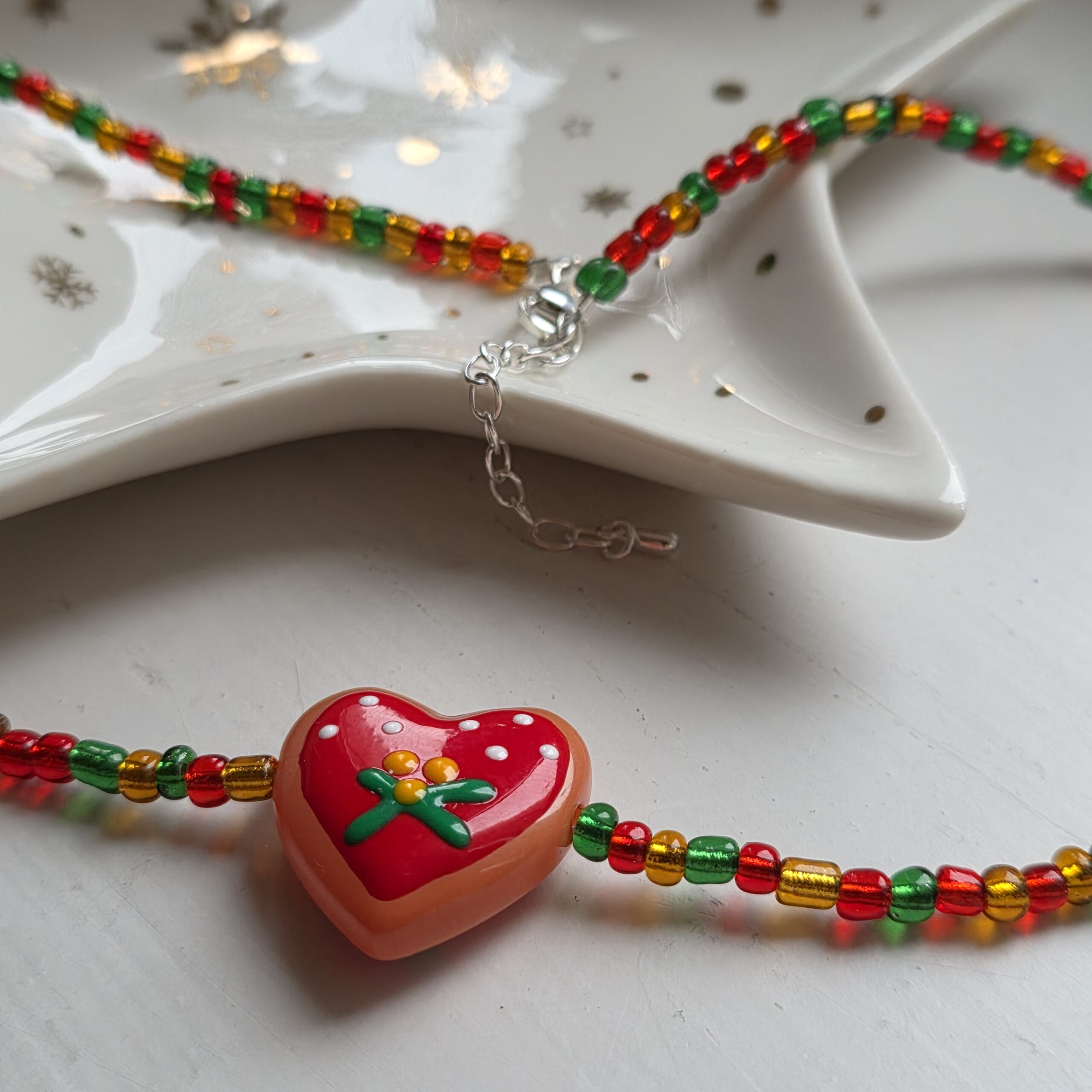 OUR LATEST LIMITED EDITION ARRIVAL FOR CHRISTMAS 2025! Say hello to our freshly baked mistletoe cookie necklace, perfectly handmade from the most Christmassy glass beads and handmade glass focal heart. This necklace is SO cutesy kitsch we actually adore it! Part of our latest Christmas collection, we only have 30 available and they all feature a 2 inch sterling silver extension chain. If you’re looking for something to really light up your festive outfits then this is for you!