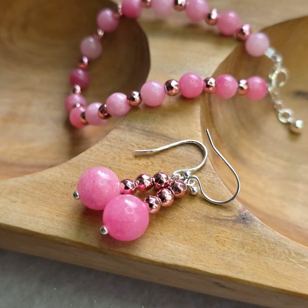 AVAILABLE FOR 2 WEEKS ONLY – LIMITED EDITION – Soft, radiant and full of Glinda-inspired charm, these drop earrings are made from smooth pink mountain jade 6 mm beads, paired with rose-gold dipped hematite beads that add a warm metallic shine between each gemstone. The colours blend beautifully, creating a delicate yet striking piece with a touch of Wicked magic.