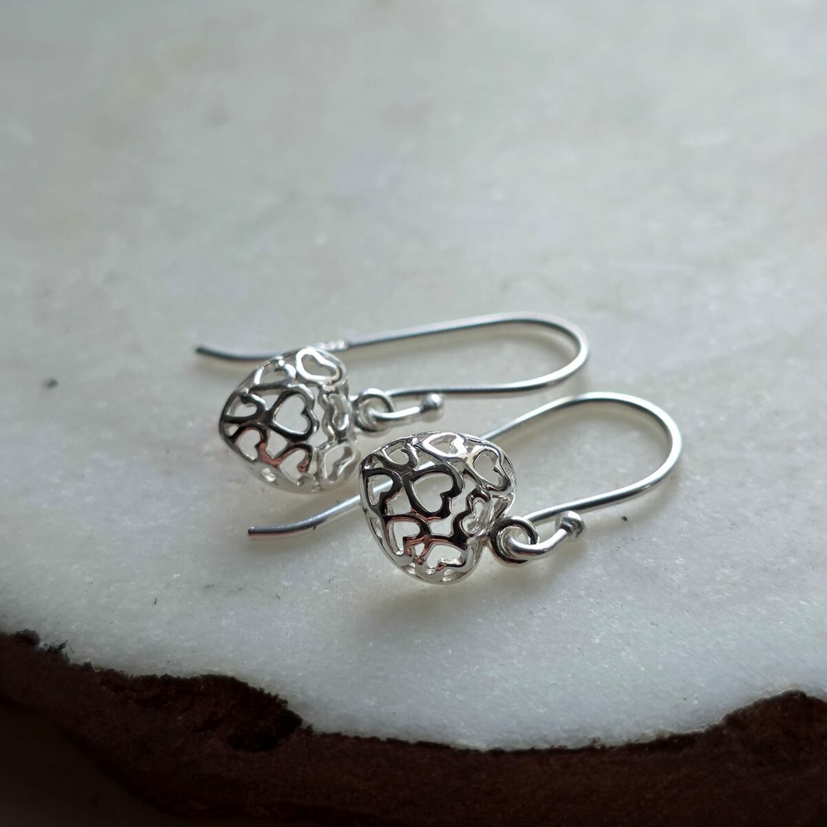 The Heart of Love Drop Earrings are a beautifully crafted pair of drop earrings made entirely from sterling silver. Designed to catch both the light and the eye, each earring features an intricate open-heart lace design, offering an elegant interpretation of love in its most timeless form. Lightweight and comfortable for everyday wear, they hang from smooth sterling silver French hook ear wires that provide a gentle, secure fit. Their versatile design allows them to move effortlessly from occasion to outfit, elevating evening looks, softening daytime casuals, and adding meaningful detail to sentimental gift-giving.