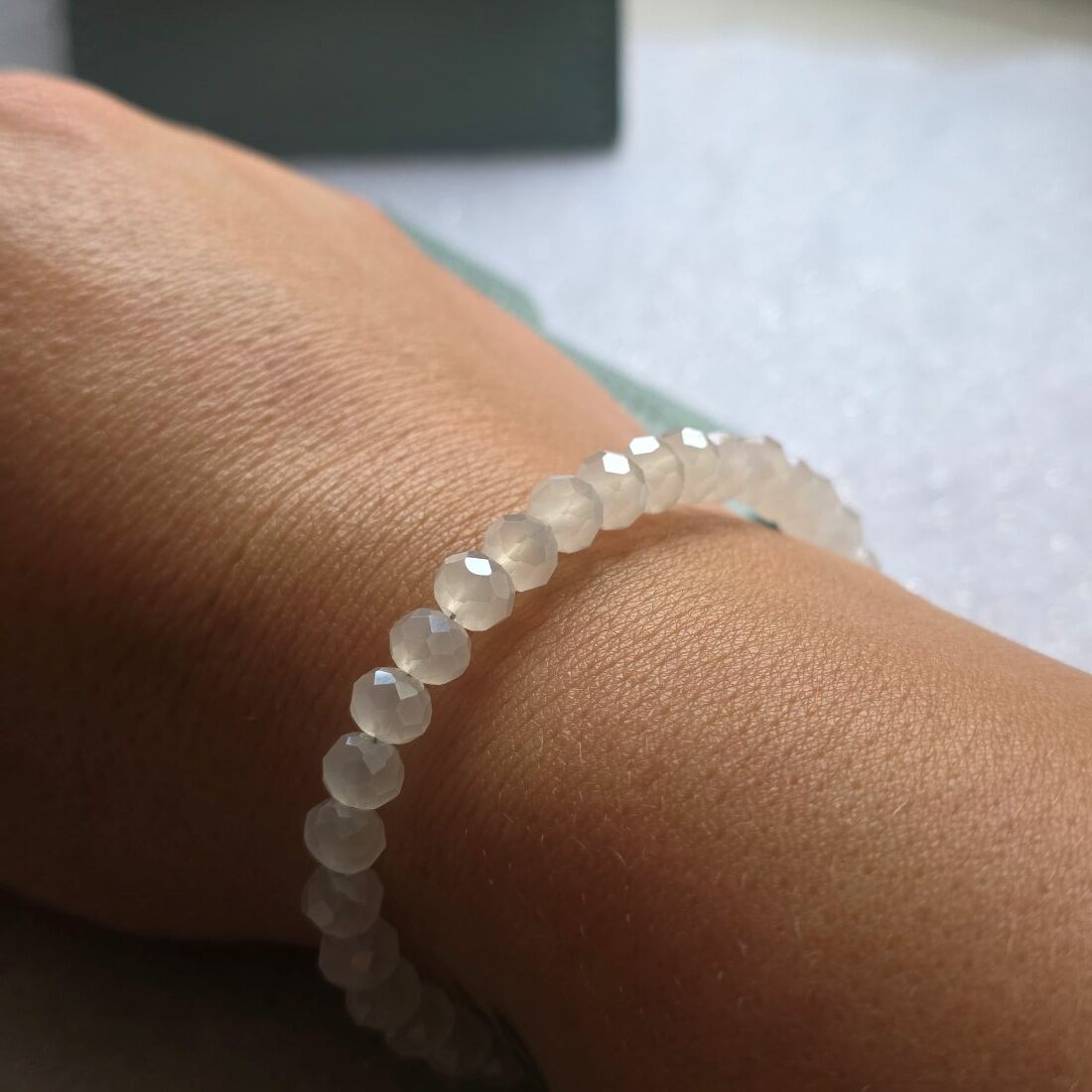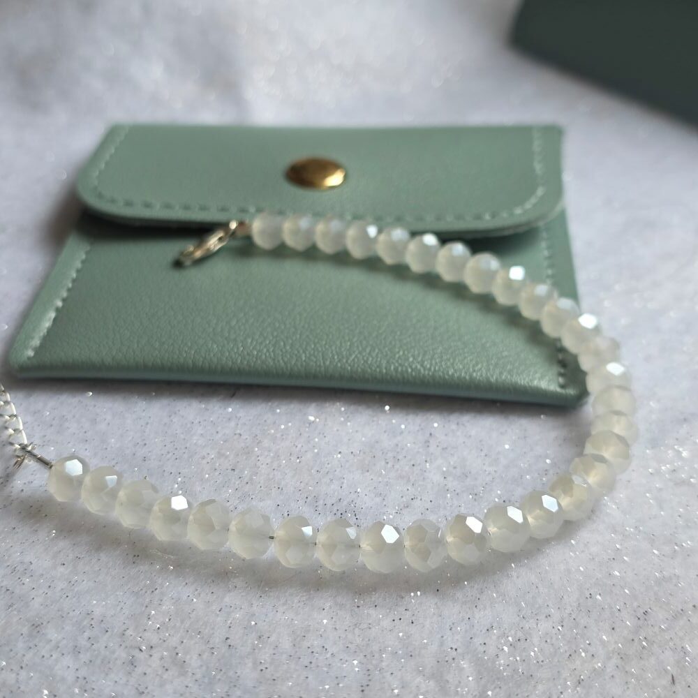 A bracelet fit for an Ice Queen — our Frosted Snow Bracelet captures the magic of a Narnian winter in every shimmering bead. Hand-strung with 8x6mm frosted faceted crystals, each one reflects the soft sparkle of freshly fallen snow beneath a pale winter sky. Finished with a sterling silver clasp and a 7–8 inch adjustable length, it offers a comfortable fit and an elegant, frosty glow around your wrist.