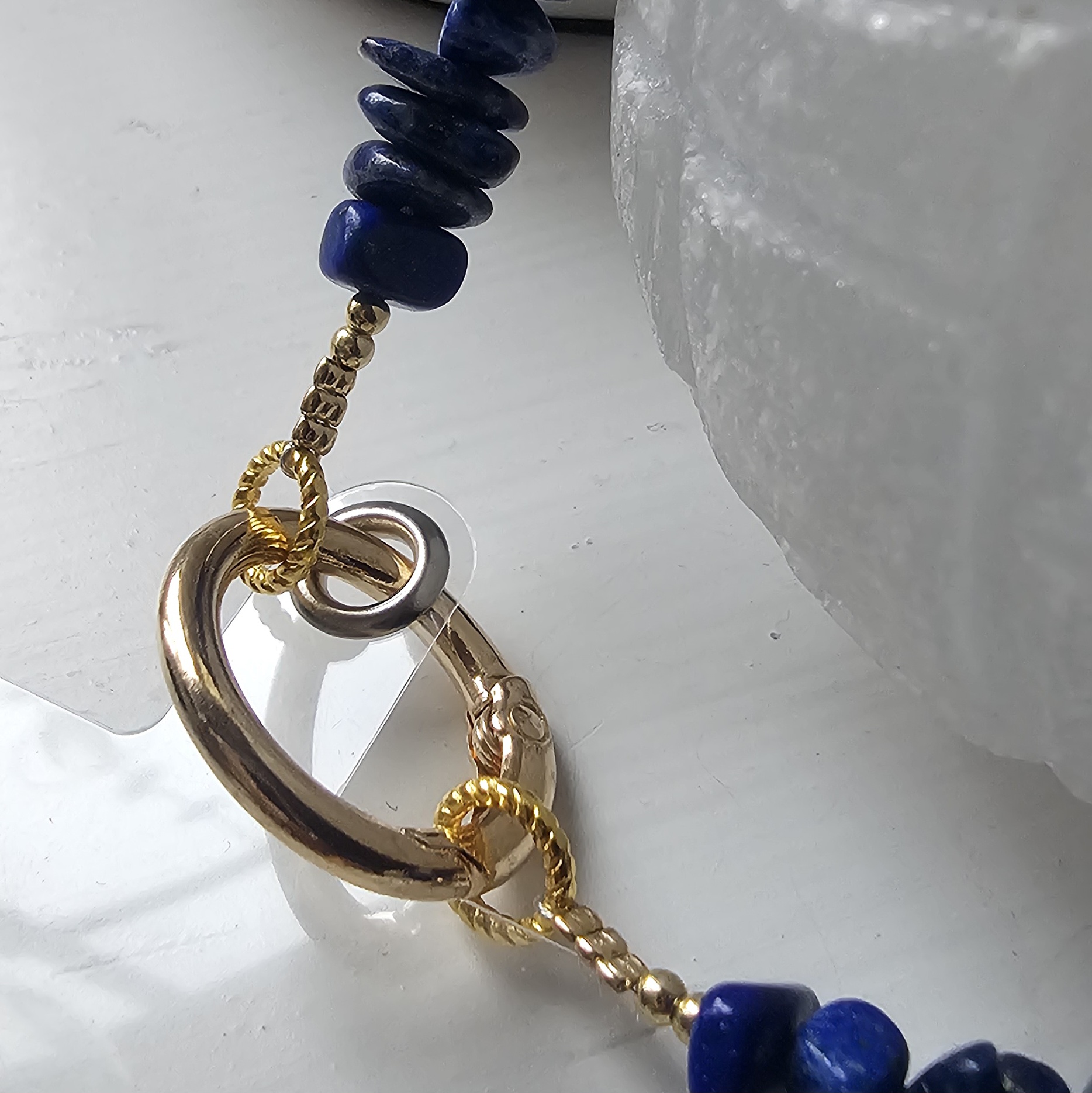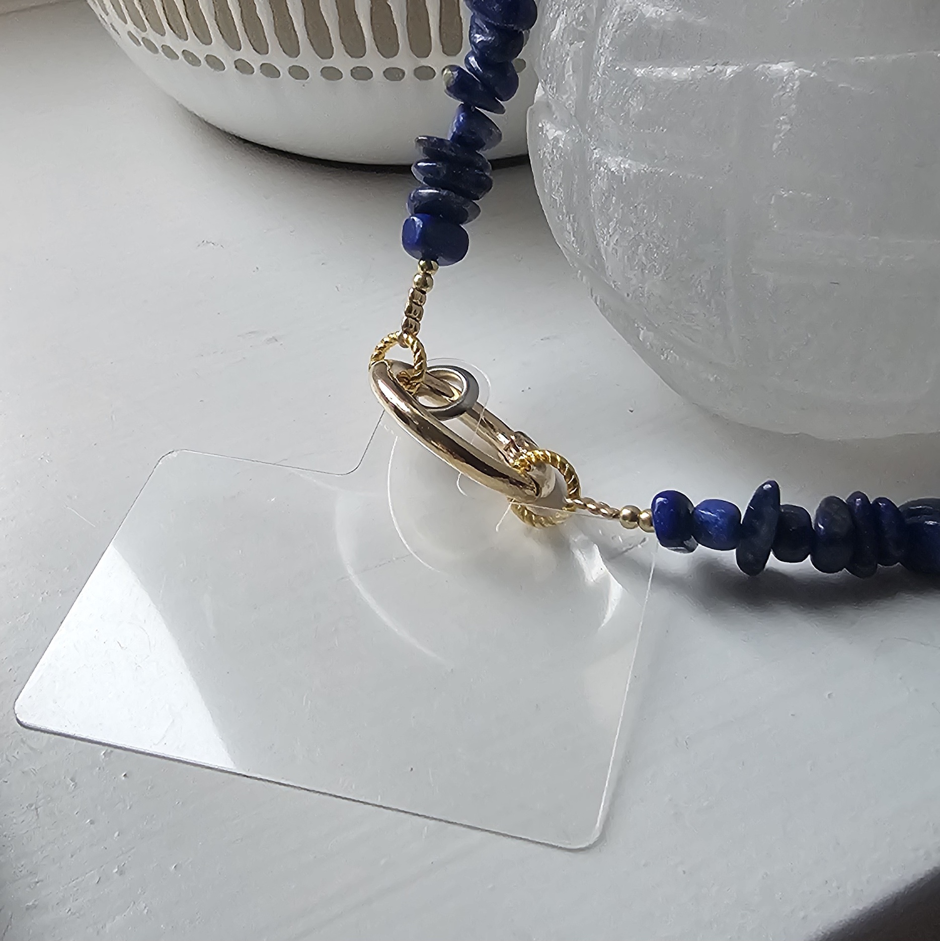 This handy phone strap makes it easy to keep your phone safe and close at hand. The included clear attachment plate fits neatly inside most phone cases. Simply unclip the strap, place the clear piece inside your case with the tab sitting at the charging port opening, then secure your case back on. Your gemstone strap hooks onto this tab, creating a strong and dependable hold. Designed using striking lapis lazuli chips, this strap is full of rich blue tones and ancient symbolism. Lapis is known for promoting wisdom, clarity, and confident communication. It has long been seen as a stone of truth and insight.