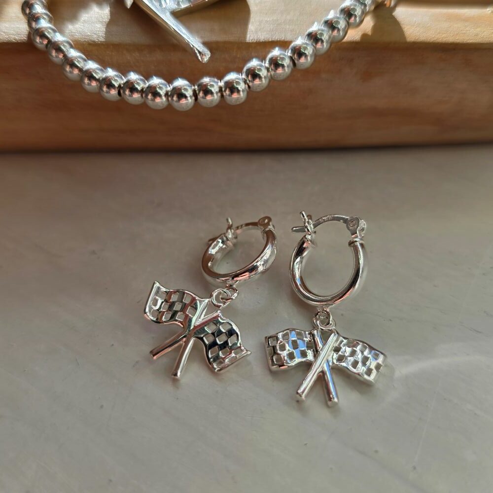 These amazing chequered double flag huggie hoops are perfectly made in sterling silver for our motorsport collectors! The perfect addition to long-time and new Smith & Perry collectors alike – what better earrings to take away with you on you on your trackside travels! Earrings will be mirror image