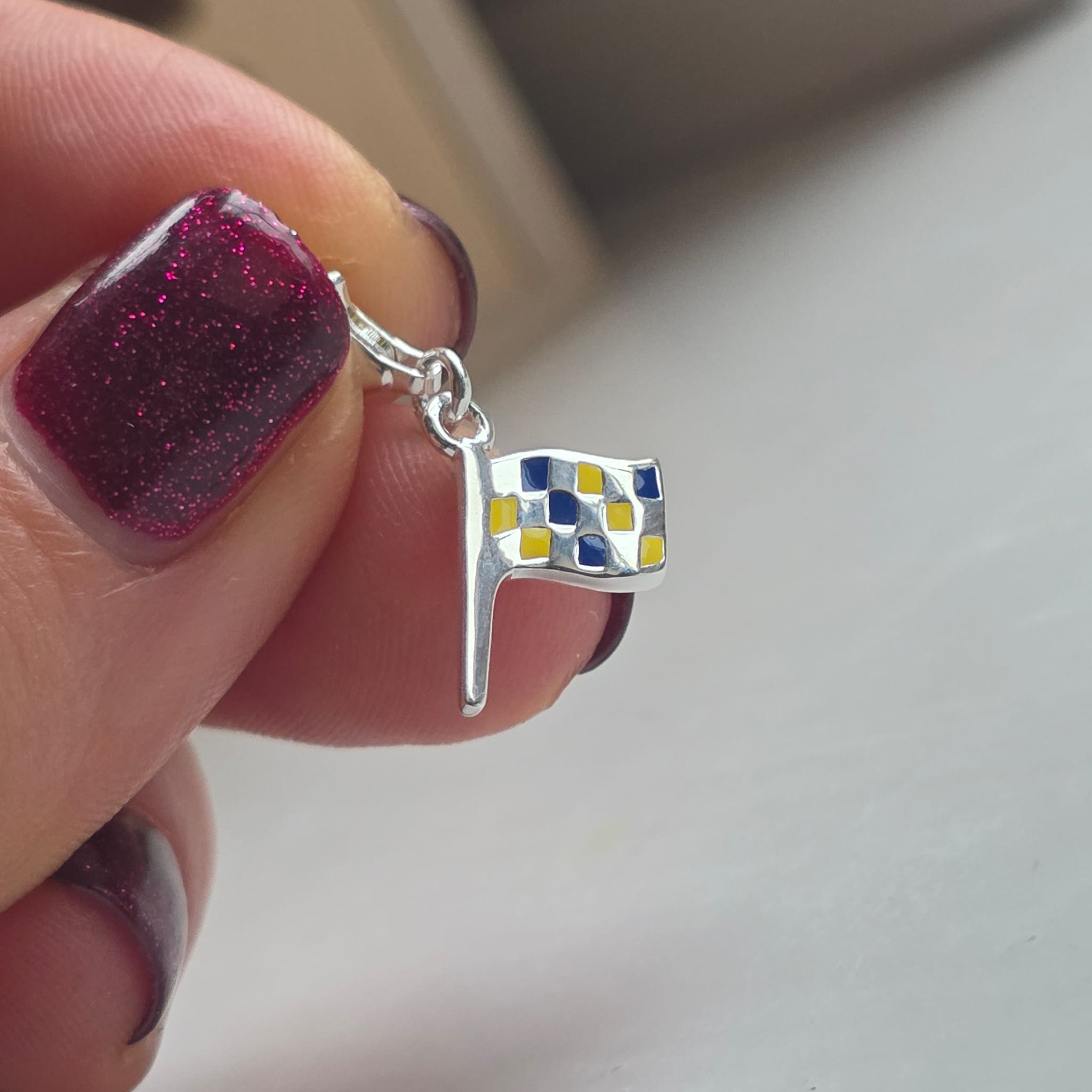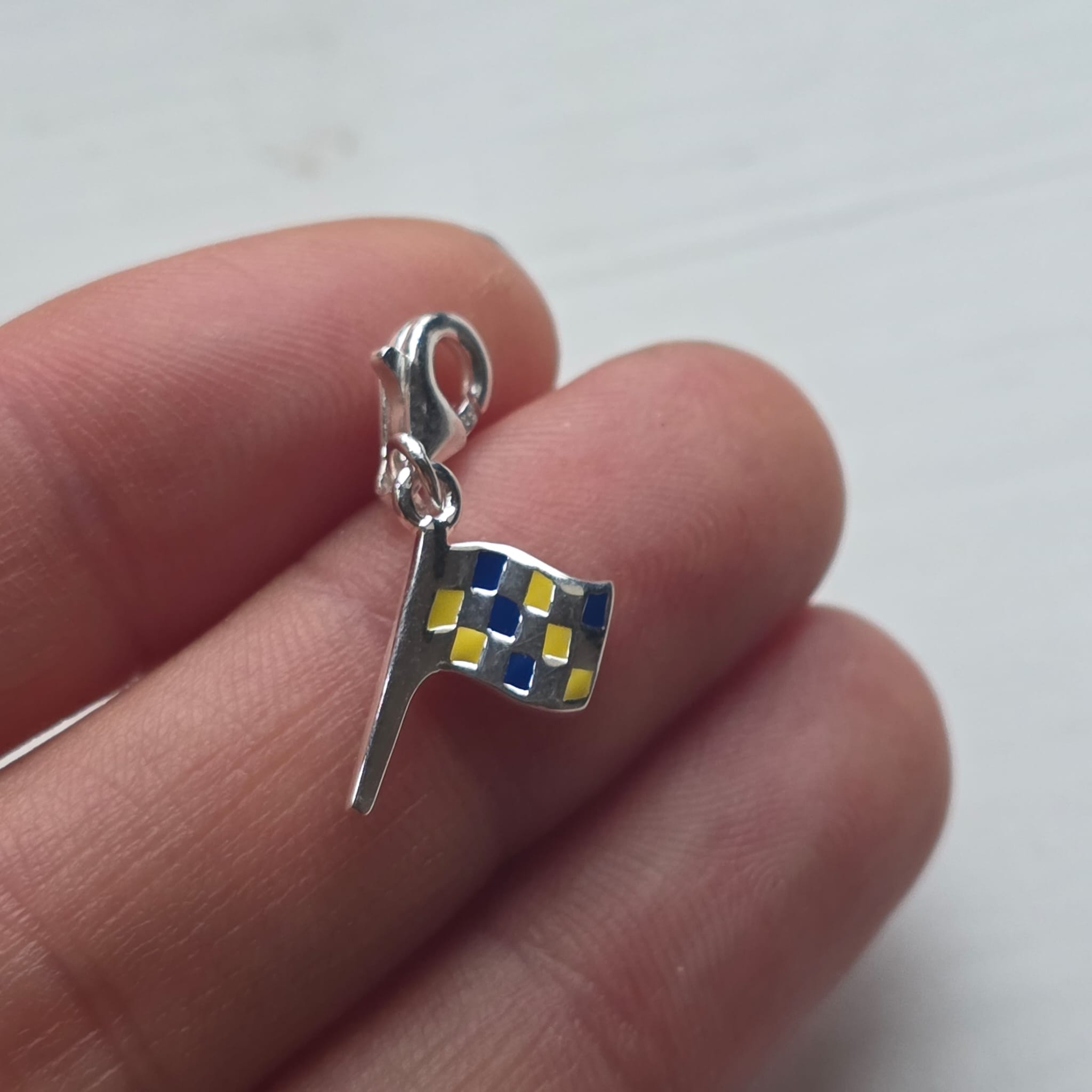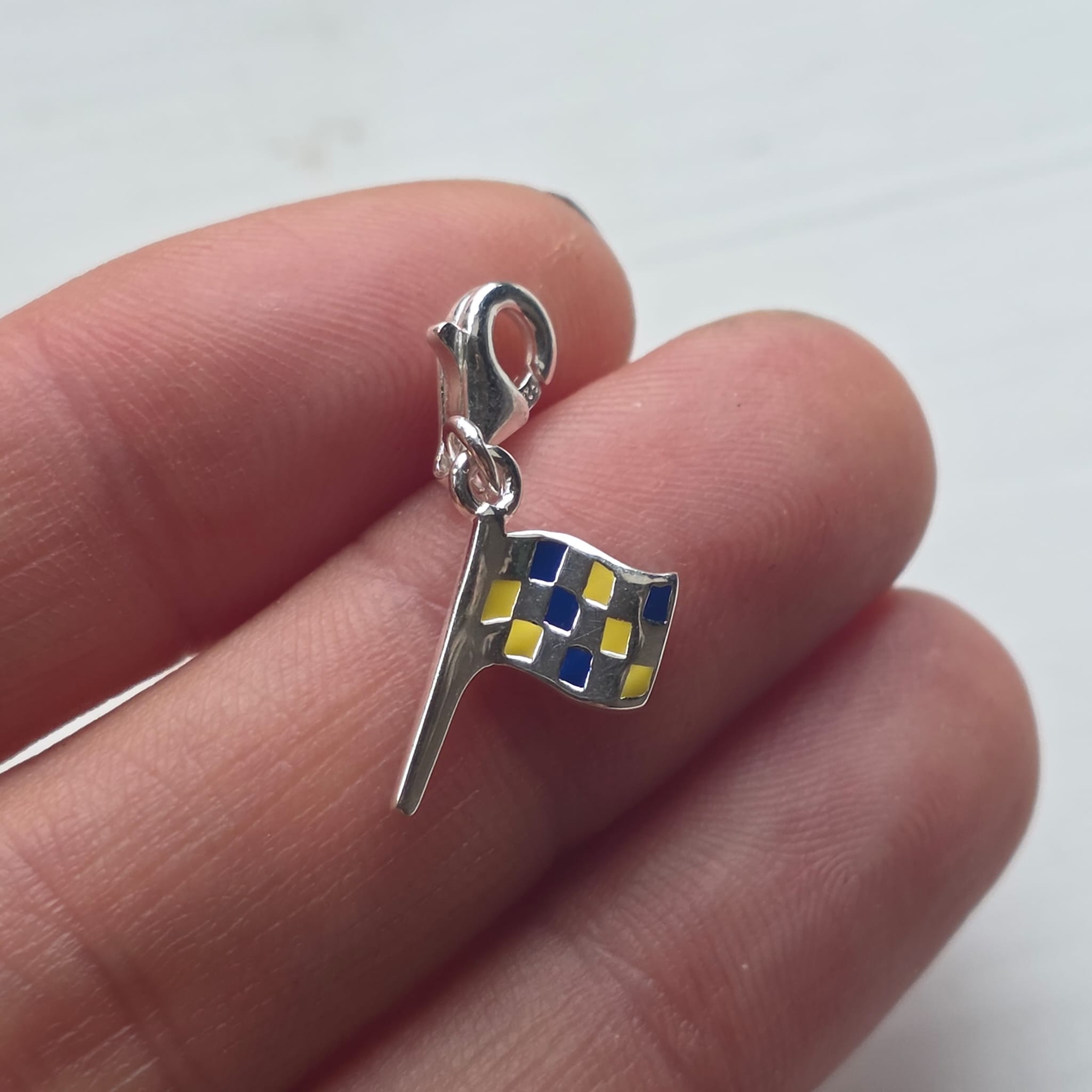 Proudly presenting this spectacular Rossi VR46 themed special edition creation of our best selling teeny tiny chequered flag charm, perfectly made in sterling silver and blue and yellow enamel Add some extra sparkle to your favourite charm bracelet- whether you’re popping it onto your bracelet for especially race day, for an evening out or as your special addition to your charm collection. This dinky charm measures just 1.5cm in size from top to bottom, and is even waved like a real flag blowing in the wind! Pick from a trigger clasp as standard or swap your trigger clasp for a Pandora style slider if needed. You can even swap the clasp for a 6mm round loop to slide it onto your own necklace chains!