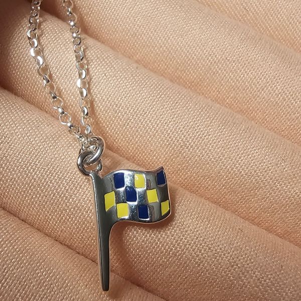 Proudly presenting this spectacular Rossi VR46 themed special edition creation of our best selling teeny tiny chequered flag, perfectly made in sterling silver and blue and yellow enamel! This dinky charm measures just 1.5cm in size from top to bottom, and is even waved like a real flag blowing in the wind! Suspending from a sterling silver open link chain of your own choice of length