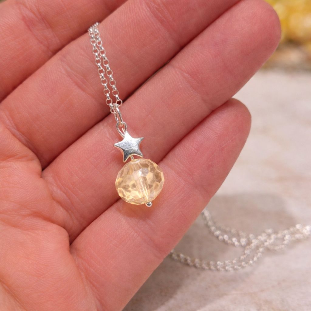 This amazing necklace features ‘that’ viral design of our best selling Nina bracelet- but as the matching necklace! Pictures simply cannot do this piece justice and each glass Nina disco stars bead is faceted with so many cuts, the light bounces from it at every angle possible! Paired with that gorgeous silver hematine star, and suspended from a sterling silver open link chain of your choice in length- we adore this piece so much! Available in both original and purple. The pendant measures around 1.5cm in total dropper length.