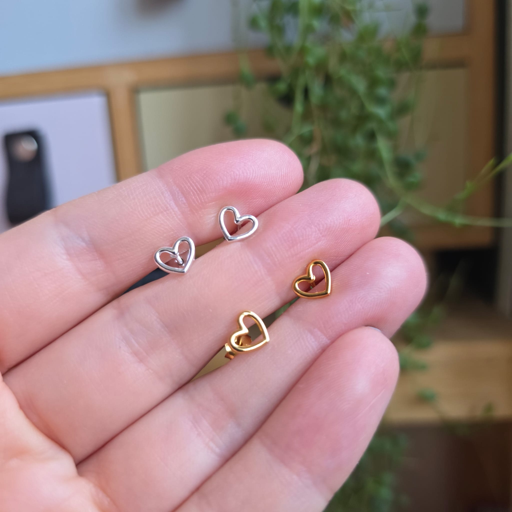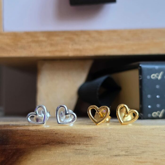 This beautiful set of two open-heart stud earrings includes one pair crafted in sterling silver and one pair dipped in warm yellow gold, both made in sterling silver for lasting quality. Measuring around 8mm each, these delicate little hearts are perfect for everyday wear and make a gorgeous treat for a loved one or a meaningful gift to yourself. Presented together in the same box, this timeless duo offers two looks in one and celebrates the simple elegance of a classic open-heart design.
