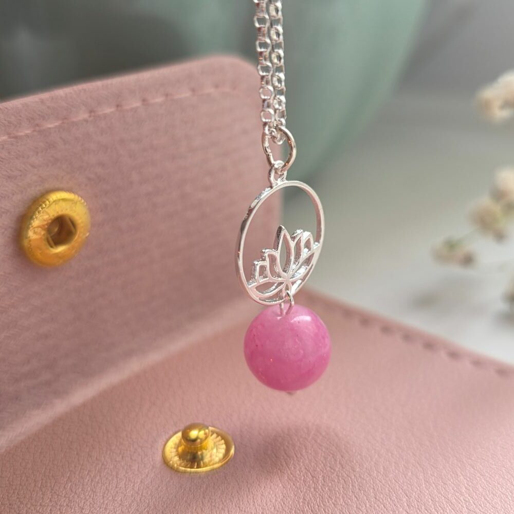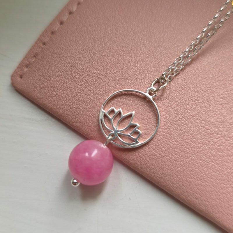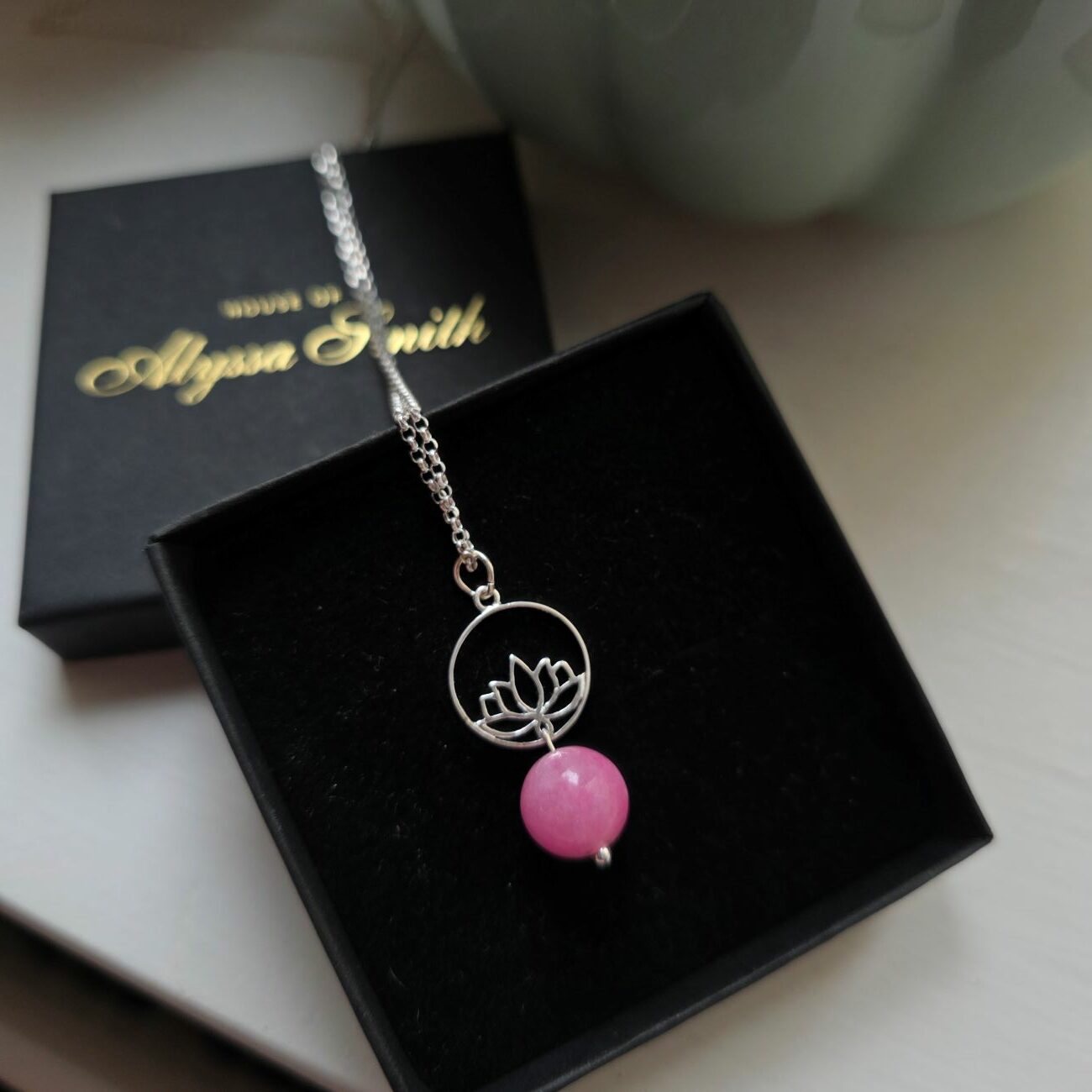 There is something quietly powerful about this piece. A symbol of growth, calm and new beginnings, the lotus flower sits at the heart of this design, paired with the soft, uplifting tones of pink mountain jade. The lotus flower is known for rising beautifully from murky waters, untouched and serene. It represents resilience, transformation and the ability to bloom no matter what life brings — a gentle reminder that strength and beauty can grow side by side. Suspended beneath the lotus sits an 8mm pink mountain jade gemstone, chosen for its soothing, heart-led energy. Known for promoting emotional balance, harmony and a sense of calm, this gemstone brings a soft, feminine warmth to the piece while adding a delicate pop of colour. The pendant measures approximately 2.5cm in size before the gemstone drop, creating an elegant, flowing silhouette that moves naturally when worn. Finished on a glittering open link sterling silver chain, available in your choice of length, this necklace is designed to sit perfectly whether worn alone or layered.
