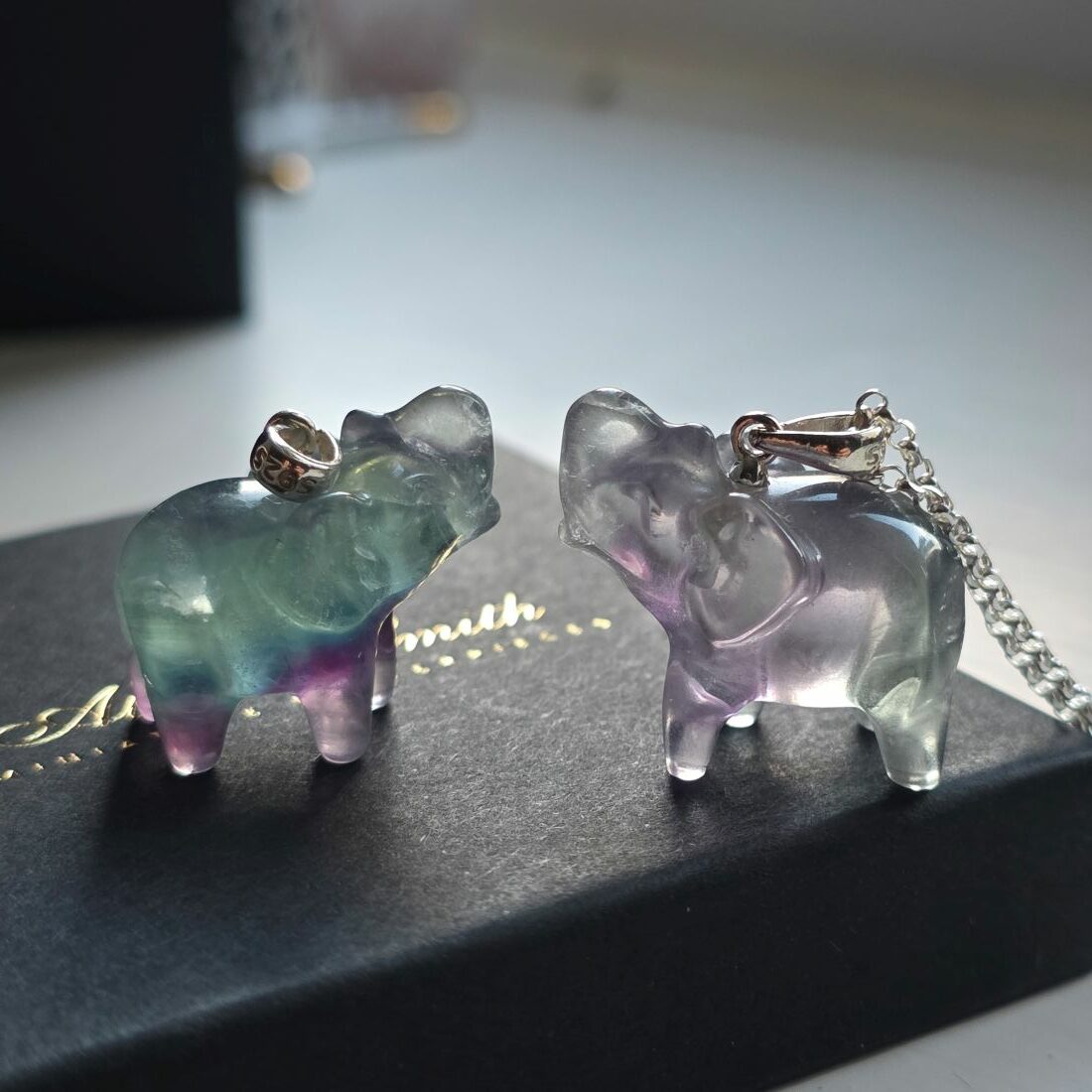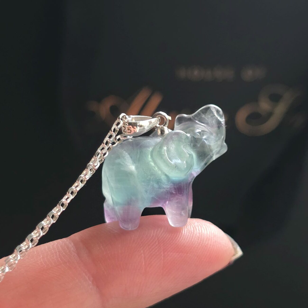 This solid gemstone Rainbow Fluorite elephant necklace is a beautiful symbol of strength, wisdom and new beginnings. Carefully polished to reveal the stone’s natural beauty, no two pieces are ever the same, with each elephant displaying its own unique blend of colours. Rainbow Fluorite can feature up to seven different shades, ranging from pale to deep greens, soft lilacs, rich purples and hints of yellow, making every piece completely individual and full of character. The elephant itself is a powerful symbol, traditionally associated with protection, good luck, stability and loyalty, making this a meaningful talisman to carry with you every day or gift to someone special. Known as a gemstone of complete transformation, Rainbow Fluorite is believed to help bring clarity, balance and focus while gently clearing negative energy. It is often chosen by those starting a new job, a new chapter, a relationship or setting fresh intentions, offering calm support and encouragement through times of change. This Rainbow Fluorite elephant stands approximately 2cm left to right, is carved from solid gemstone, and suspends from a sterling silver open link chain in your choice of length, creating a thoughtful, symbolic piece designed to support you on your journey.