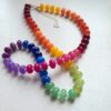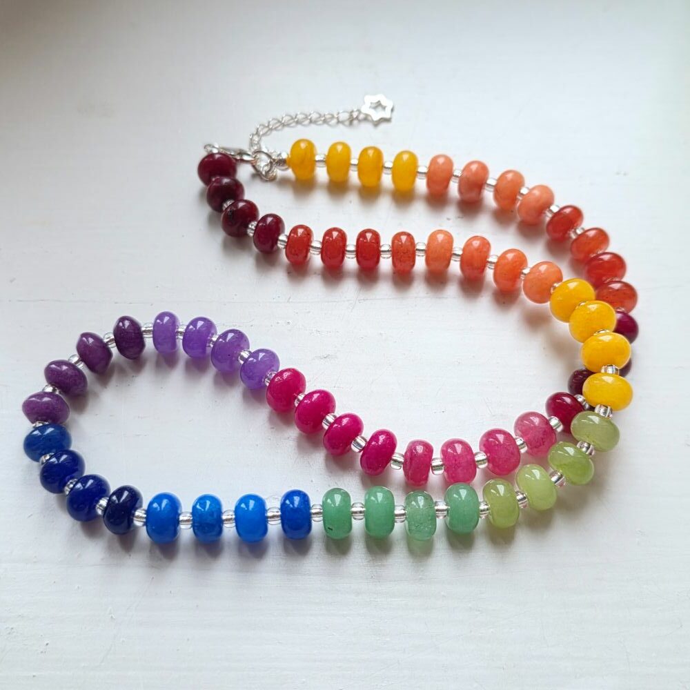 This vibrant necklace has been thoughtfully designed as a wearable mood-booster, inspired by colour therapy and the way colour can gently influence how we feel each day. Created using dyed rainbow jade beads, each bead measures approximately 8 x 6mm and is polished to a smooth, glossy finish, allowing the full spectrum of colour to shine beautifully when worn. Colour therapy is rooted in the belief that different colours can support emotional balance and wellbeing. Warm tones such as red, orange and yellow are often associated with energy, confidence and positivity, while cooler hues like green, blue and purple are linked to calm, clarity and emotional grounding. By bringing these colours together in one harmonious piece, this necklace is designed to offer a sense of balance, encouragement and uplift, whether you are navigating a busy day or simply need a gentle reminder of joy and colour. We launched this necklace as a small but meaningful way to help improve moods and add a little brightness to everyday life. It is perfect for those who love jewellery with intention, or for anyone seeking a colourful pick-me-up during times when they need extra positivity close to them. The necklace measures 18 inches and is finished with a 2 inch extension chain, allowing you to adjust the length for comfort and layering. A versatile and expressive piece, it is designed to be worn daily as a symbol of balance, optimism and self-care.