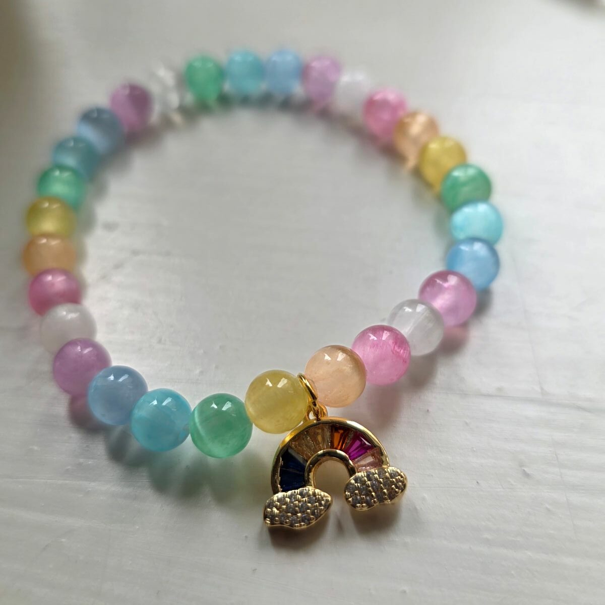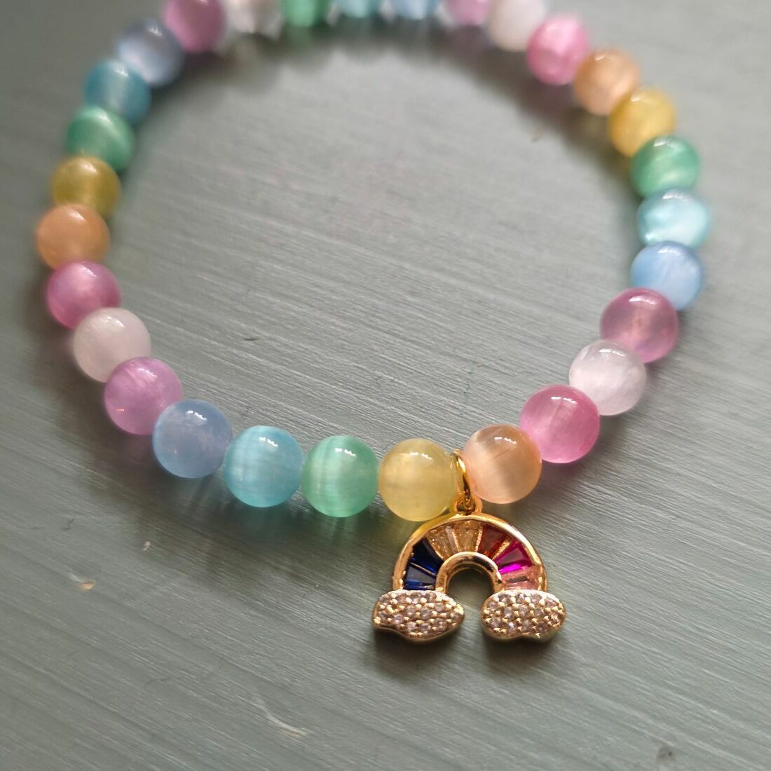 Rainbow Selenite Gemstone Bracelet with Rainbow Charm