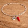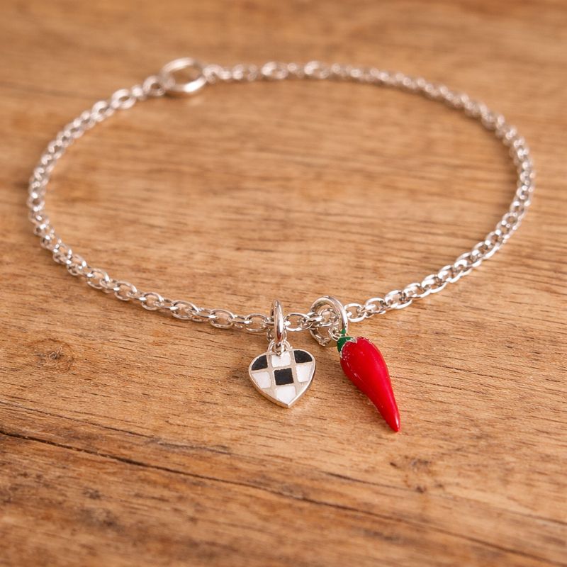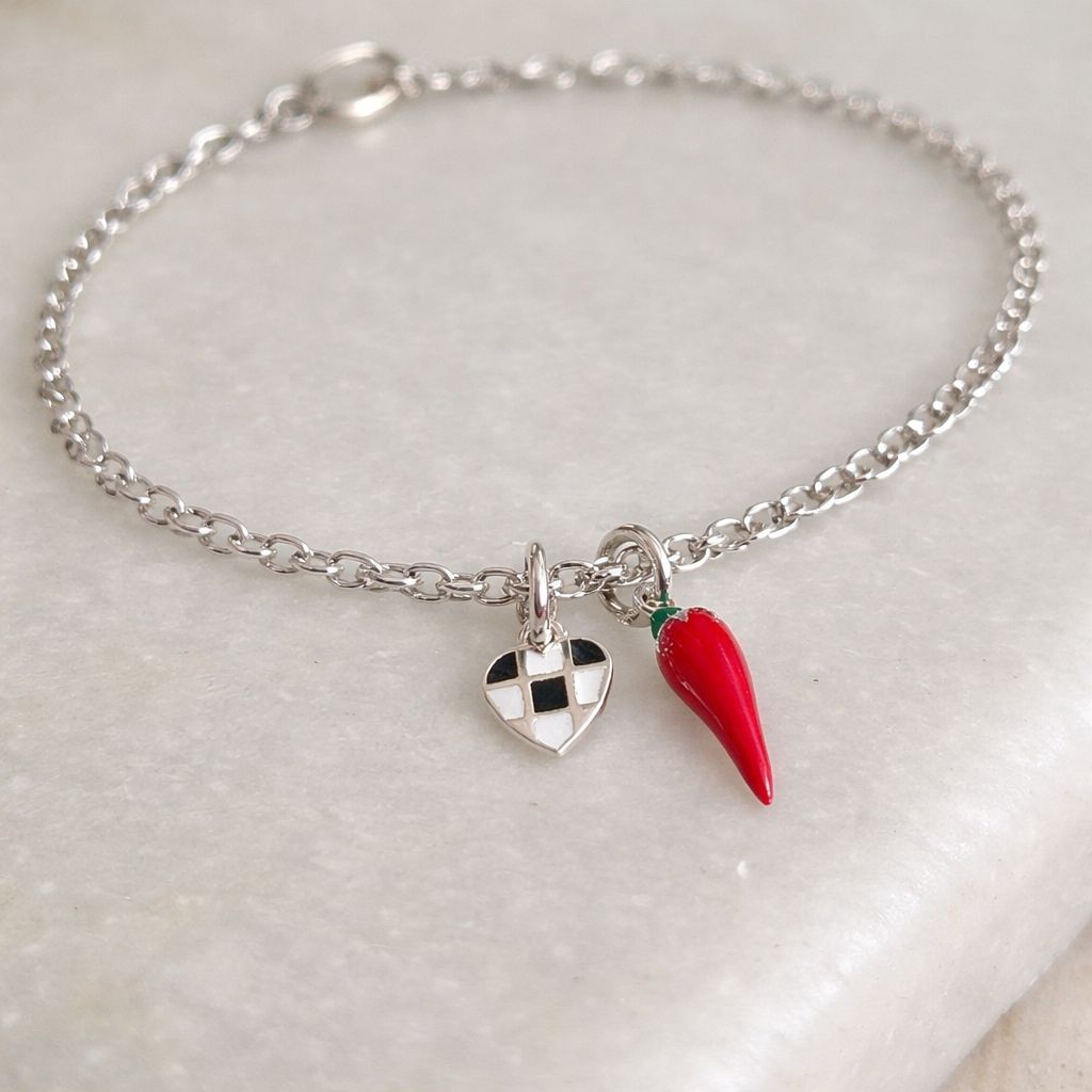 Sainz Chilli Pepper Themed Chain Bracelet in Sterling Silver with Tiny Chequered Heart