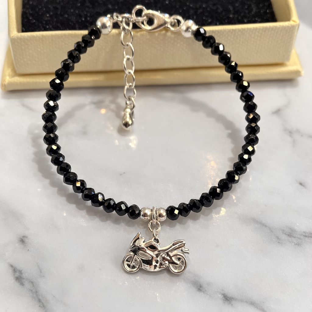 The most sparkling edition to our popular beaded gemstone bracelets- proudly presenting our stunning 3D motorbike bracelet! This incredible bracelet sparkles from every angle thanks to the top grade black faceted spinel gemstones we have used for it, and each bracelet is made to order by Alyssa. Layer up with other nothing style bracelets or just wear this alone, the choice is entirely yours! This bracelet can be worn anywhere from 7 to 8 inches in length. If you’re looking for a new miniature masterpiece which has ALL the sass and sparkle, and can take you from day to night, this is it!