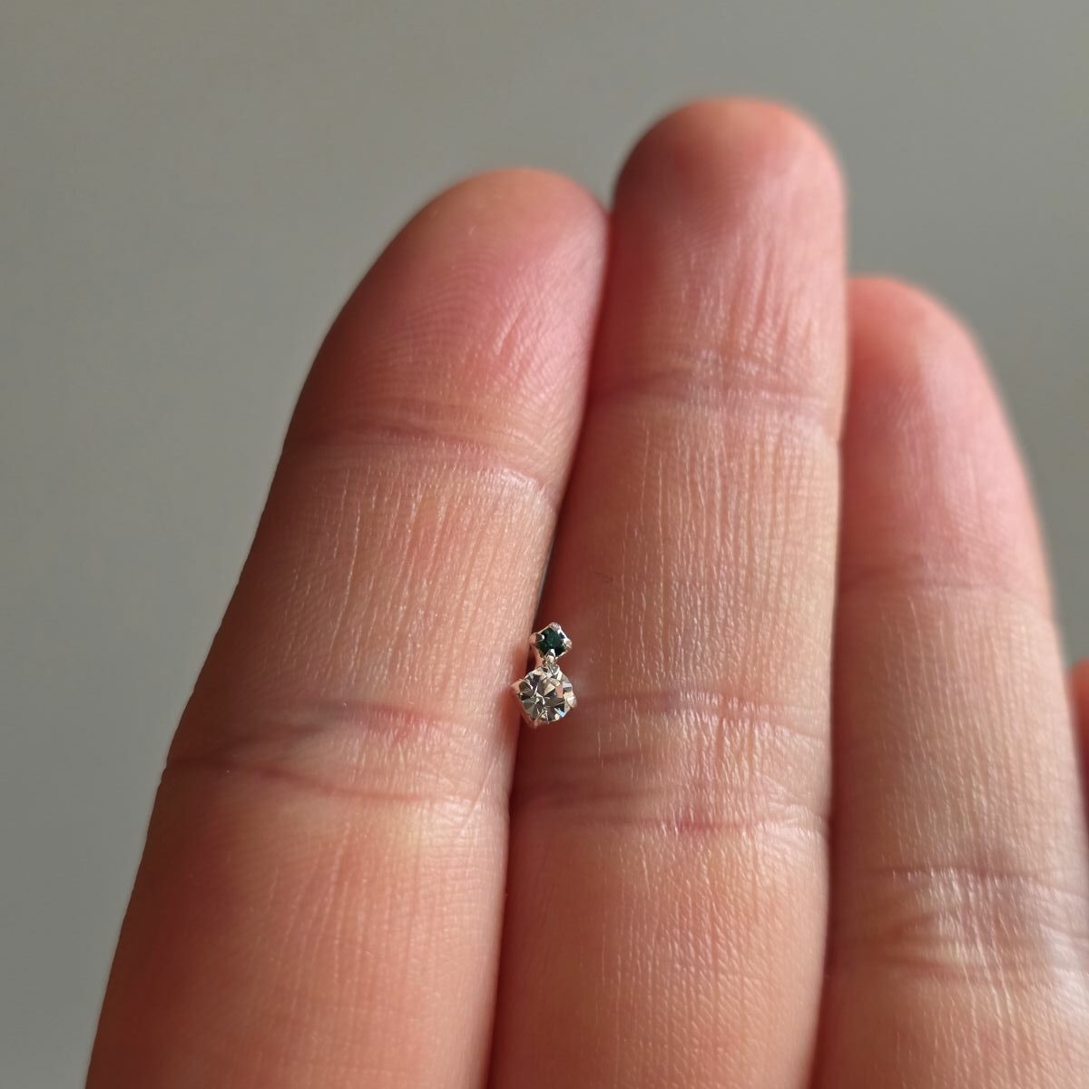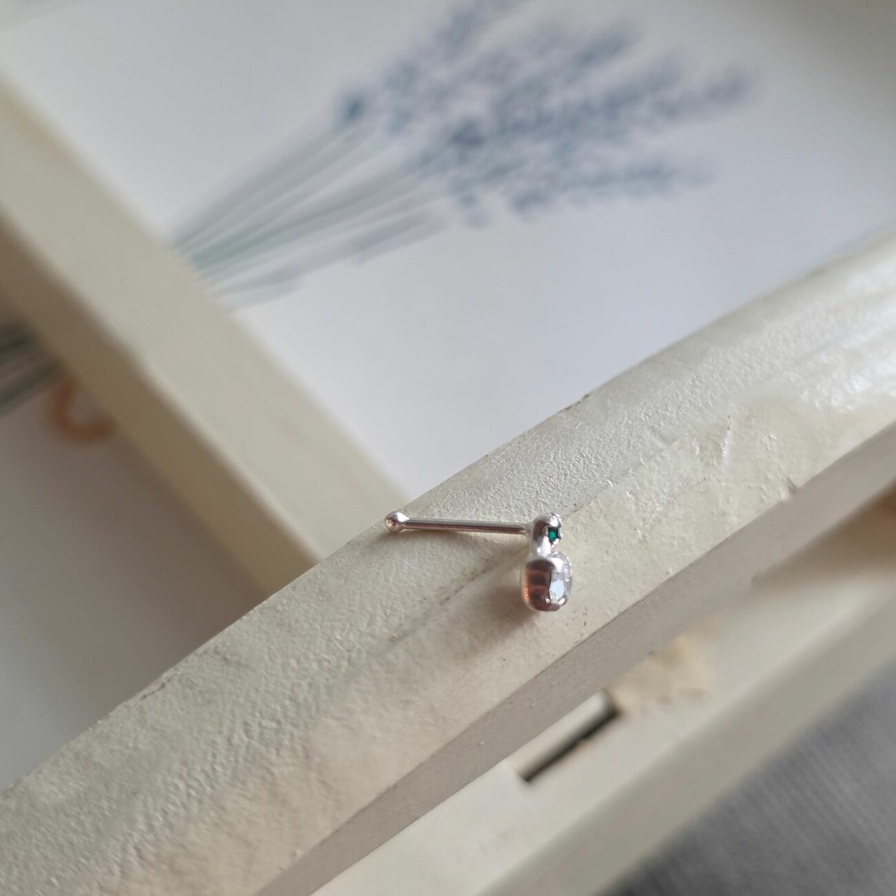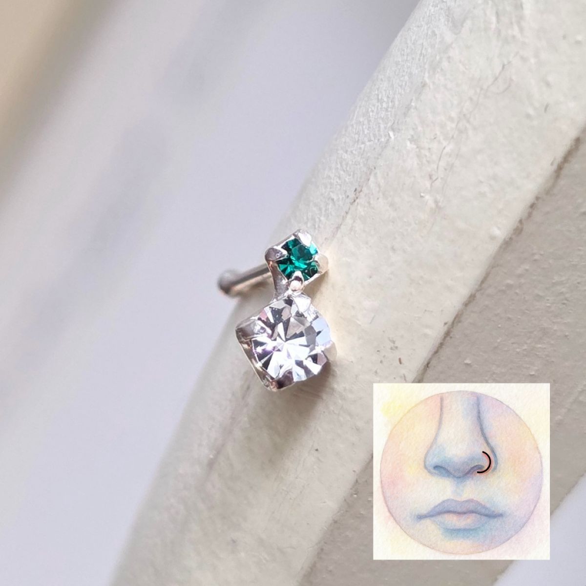 A beautiful and delicate sterling silver nose stud, this sparkling green emerald city design adds unique glam to your outfits and is a real show stopper! Featuring a push through design, it is easy to fit at home. The stud measures around 5mm in total length and is perfect for anyone looking for some razzle dazzle! Please take care when washing your face so as not to catch your stud.