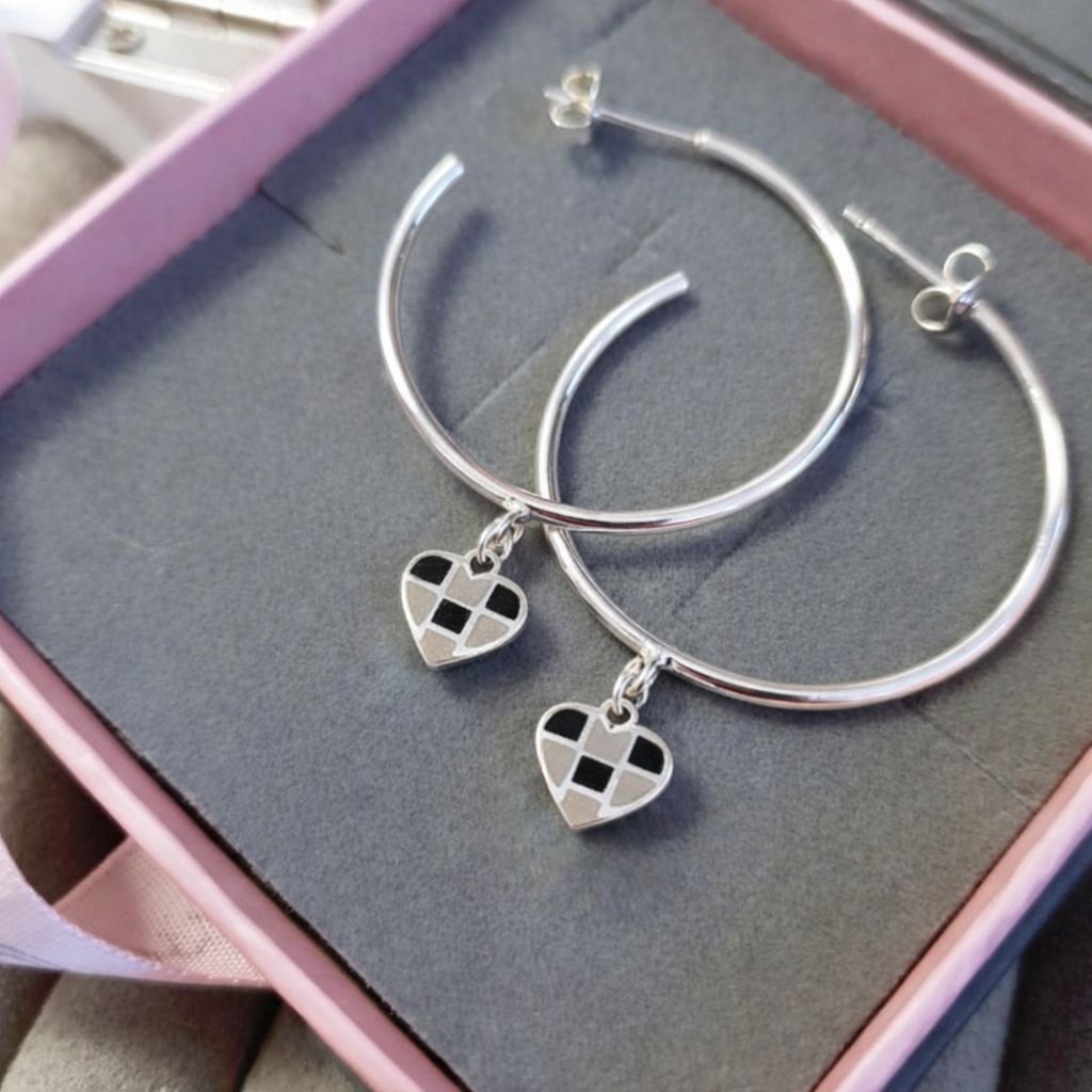 They measure 3cm in diameter, and are crafted to be lightweight so they do not weigh your ears down like some large hoops do. They feature dangling sterling silver tiny chequered hearts that have been so popular in our motorsports collection! These are the perfect treat to yourself, or gift to a friend or loved one- we all know someone who just LOVES their hoops! These beautiful earrings will come packaged in Alyssa Smith branded packaging with added, biodegradable sparkles- how cute!