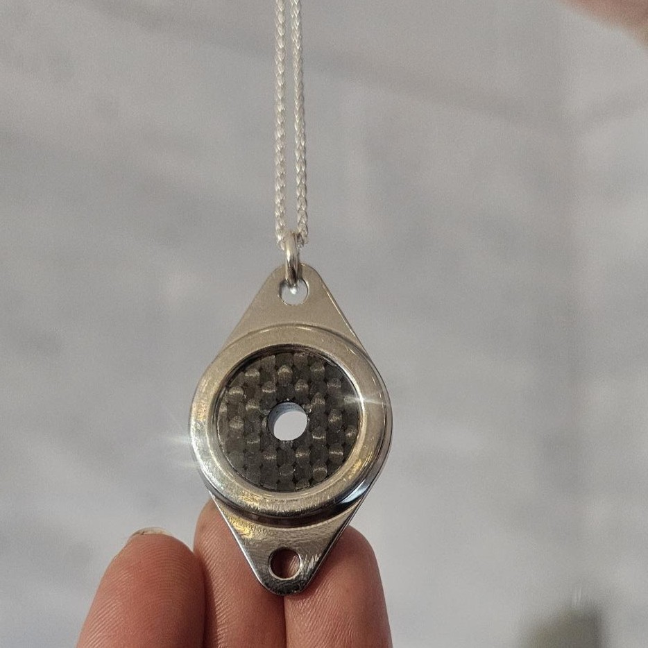 This striking statement pendant has been precision-crafted to resemble the mounting plates used throughout Formula One engineering. Finished in sleek sterling silver and set with REAL carbon fibre taken directly from a retired Red Bull Racing F1 car, this piece carries authentic racing DNA in every detail. Now available for a limited time only, as part of our incredible partnership with Racing Gold, who specialise in giving new life to genuine Red Bull F1 components. Our newest addition to our ever-growing carbon collection, this miniature masterpiece allows you to wear a fragment of a machine that once tore around the world’s greatest circuits. Measuring approximately 3.5cm from top to bottom, the pendant is suspended from a robust sterling silver spiga chain in the length of your choice.